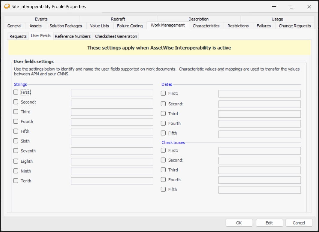 10. Select the User Fields tab, if it is available. For example:Note: To use this functionality in APM, you must enable feature 48. In the Enterprise window, select the Features view and the Enabled Features tab. Click Browse, select “Support for user-defined fields on AssetWise Interoperability Work Documents”, and click OK. If APM is running as a smart client, click Refresh Enabled Features on the server. Then restart the client to use the functionality.
