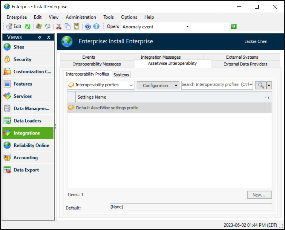 1. In the Enterprise window, select the Integrations view, the AssetWise Interoperability tab, and then the Interoperability Profiles tab.
