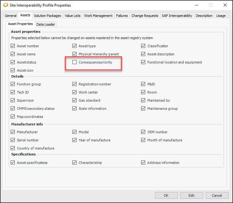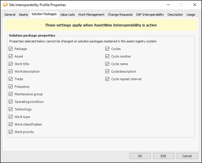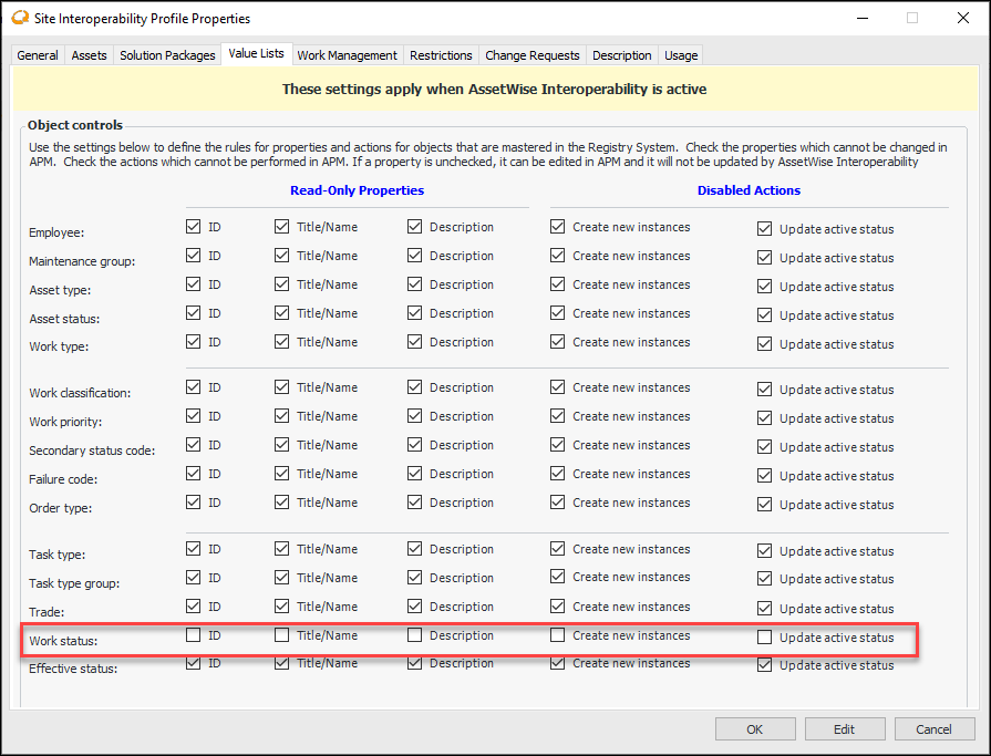 Note: When your integration includes two or more APM sites exchanging data with CMMS instances, be sure to activate interoperability on the parent APM site, as well as its child sites. See Activating AssetWise Enterprise Interoperability in APM.Tip: This step is optional. AWEIS will always use the InfoSource mapping to the site to add new values.This setting is located in the Site Interoperability Profile window, Work Management tab, Requests tab. For more information, see Setting up Site Interoperability Profiles for AWEIS.For more information, see AssetWise Enterprise Interoperability Server Setup Guide.Using APM Editing Rules