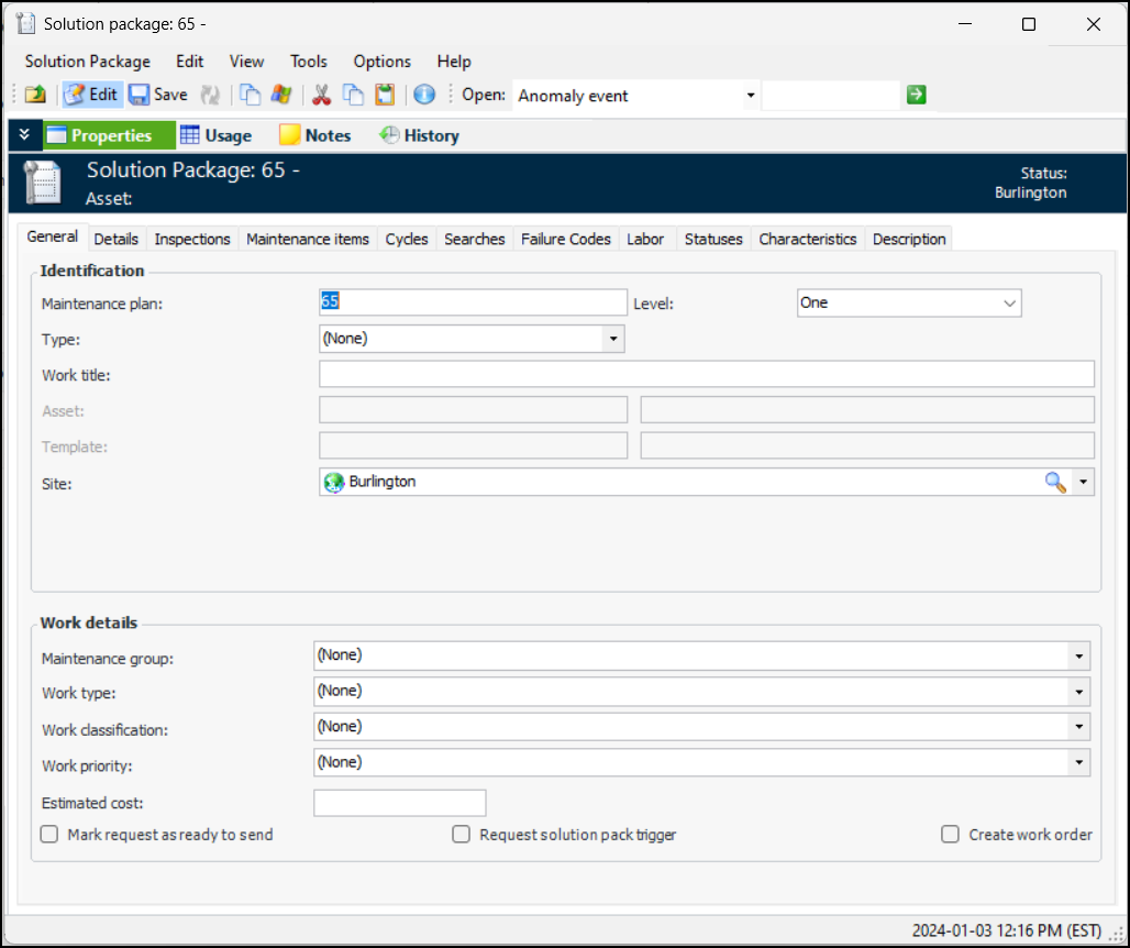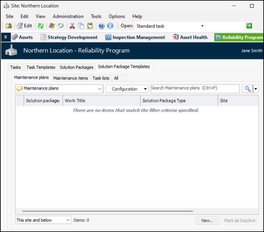 2. On the Program tab, select the Solution Package Templates tab. This tab displays a tab for each of the solution package levels defined in the site interoperability profile. In this example, the levels are Maintenance plans, Maintenance items, and Task lists: