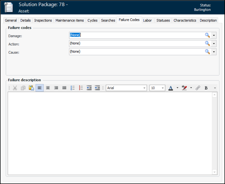 13. If available, select the Failure Codes, for example:Solution packages support failure codes, if specified by the Failure code type setting in the site’s interoperability profile. You can select failure codes and provide a default description on solution package templates. When a solution package is referenced in a request for work or other work document, the failure codes are copied from the solution package. Note that if the work document already has one or more failure codes, those codes are not replaced by values from the solution package.