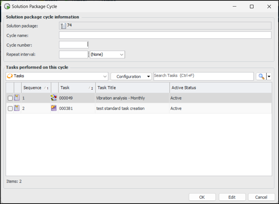 3. Select the appropriate tab and click New to open the Solution Package window. This example shows a maintenance plan: