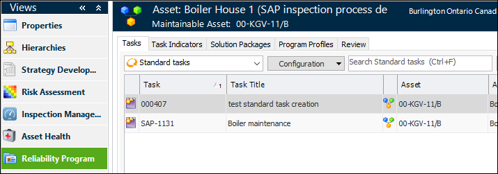 In an Asset window, select the Reliability Program view to see the asset’s standard tasks, task indicators, solution packages, and program profiles: