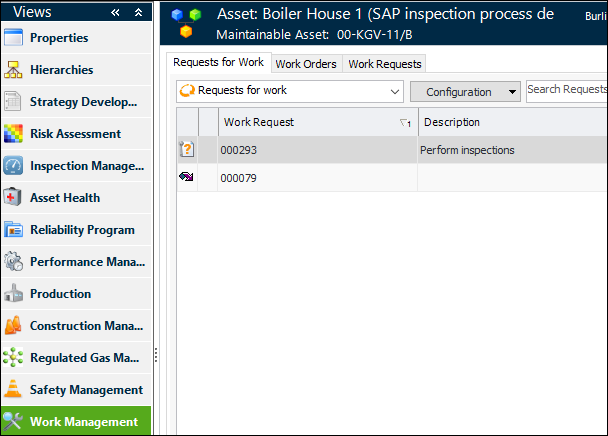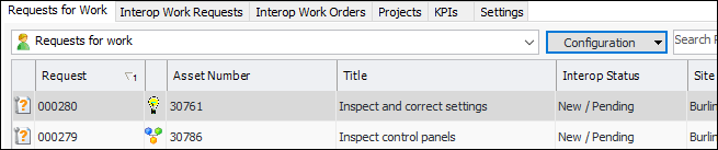 In the Asset window, select the Work Management view to see the asset’s requests for work, interop work orders, and interop work requests: