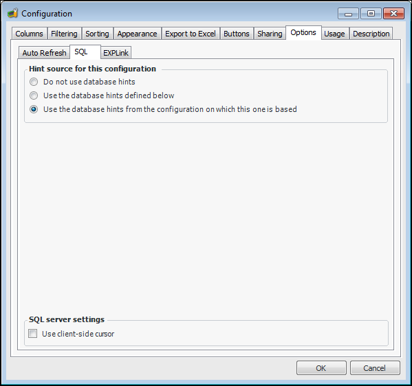 Note: For SQL Server databases, only query hints are allowed (hints that are appended to the end of an SQL statement). APM does not support table hints or join hints in SQL Server databases. For more information on using hints with SQL Server, see the SQL Server Books online help file.To Add Hints to a Configuration