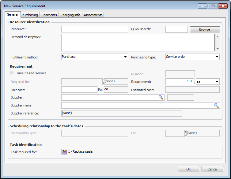 7. Select the Comments tab to enter your notes. For requirements that must be purchased, you can also add instructions in the Purchasing description box. This information is copied to subsequent documents in the purchasing flow, for example, the purchase order line created from the work order task.