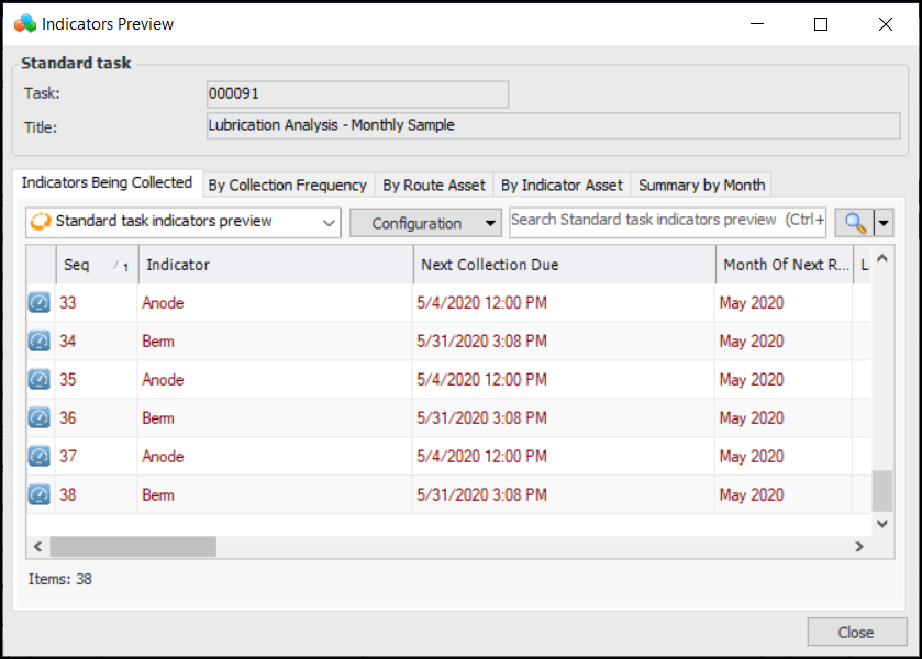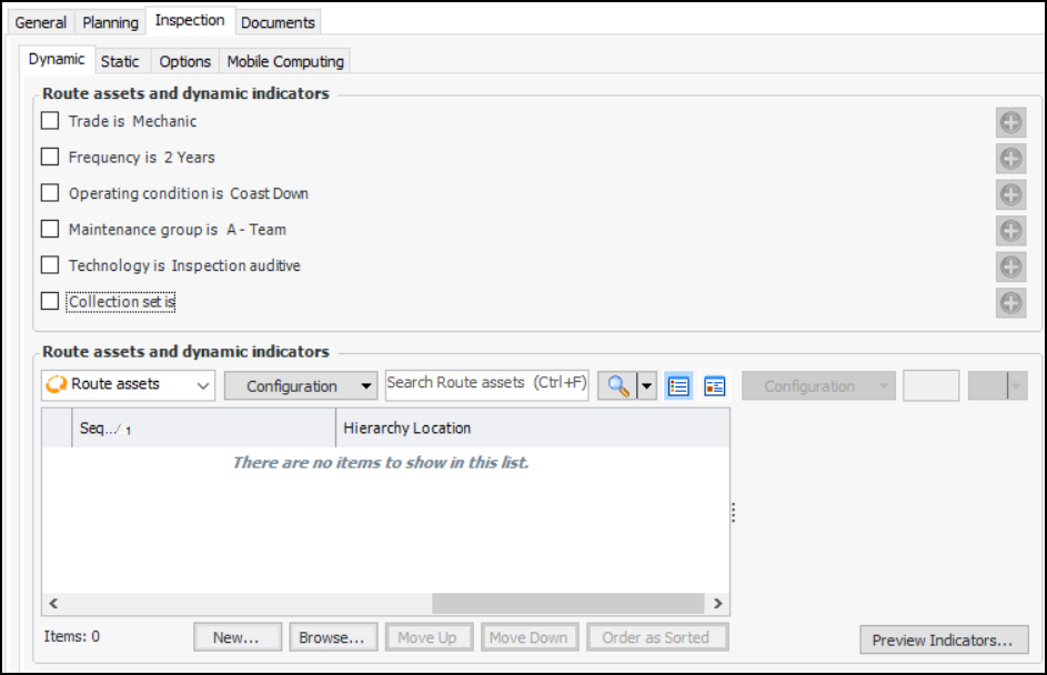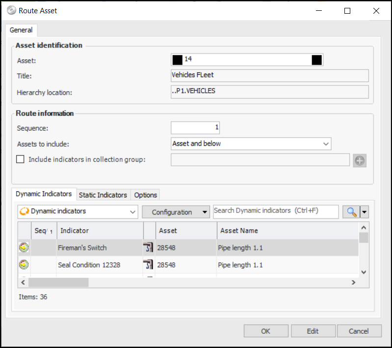 7. You can view the indicators associated with the route asset. The Dynamic Indicators tab lists the asset’s indicators that match the selection criteria. The Static Indicators tab lists any of the asset’s indicators that have been manually added to the task. For example:
