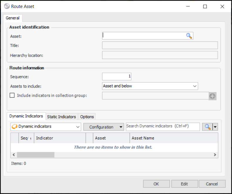 1. In the Route assets and dynamic indicators area, click New to add a route asset. The Route Asset dialog appears: