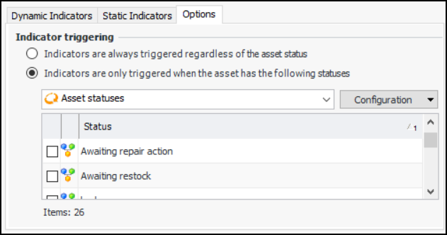 • Click Indicators are only triggered when the asset has the following statuses. Asset statuses are listed.