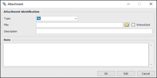 • File: You can attach files with standard formats. If the file is not on a shared network drive, you can select Embedded so that other users can access it.