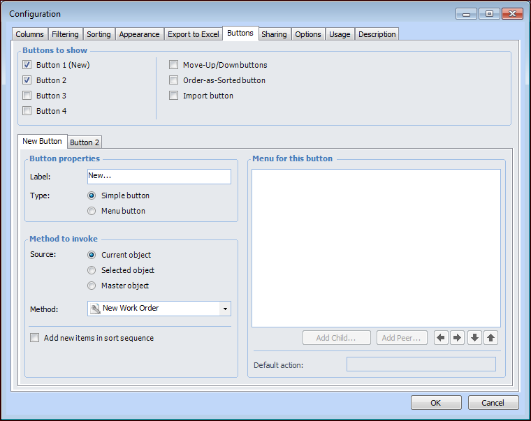 2. Select the Buttons tab. Select Button 1 (New) and any additional buttons required. A tab is added for each of the buttons. For example: