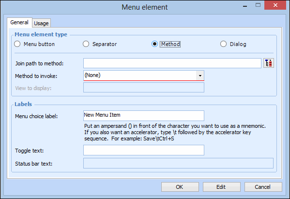 7. Click OK when you have finished defining the menu element.