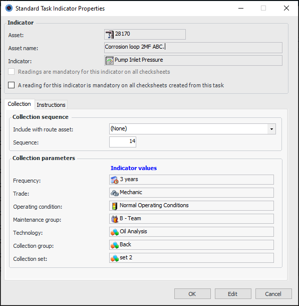If indicator readings are to be collected using a mobile device, you can have the activity assigned to a device automatically when the work order is created. Once you add an indicator to the standard task, the Mobile Computing tab becomes available on the Inspection tab. For more information, see Setting Mobile Computing Options on a Standard Task.If you want to edit a standard task that is based on a task template, see Editing a Standard Task that is Based on a Template.This topic explains how to add static indicators to a standard task. For information about changing the order of indicators, see Changing the Order of Indicators on a Standard Task. For information about setting options for indicator inclusion and planning lead time, see Setting Inspection Options for a Standard Task.Tip: You can also add indicators by clicking the Tools menu in the Standard Task window, clicking Indicators, and then Work With. In the Work With Standard Task Indicators dialog, you can use drag-and-drop functionality to copy indicators from one task to another or from an indicator to the task.To Add Static Indicators to a Standard Task
