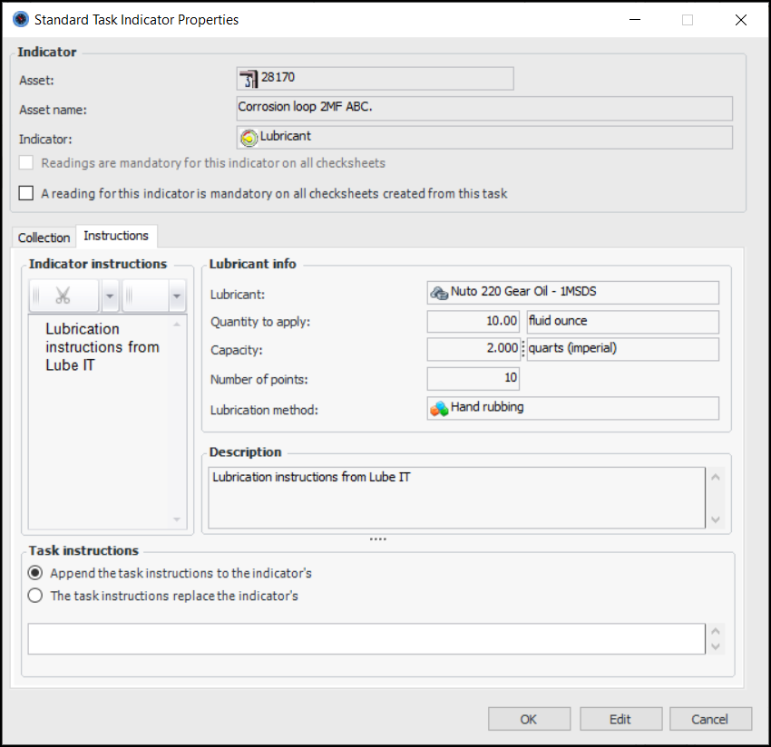 12. Select the Instructions tab to view indicator instructions. If the indicator type includes lubricant information, it is also displayed on this tab. For example: