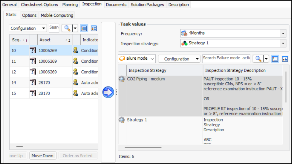 4. If supported by the work type, the Static tab displays a side-bar showing recommended tasks and inspection strategies from primary and secondary action plans that identify the standard task as the inspection task. For example: