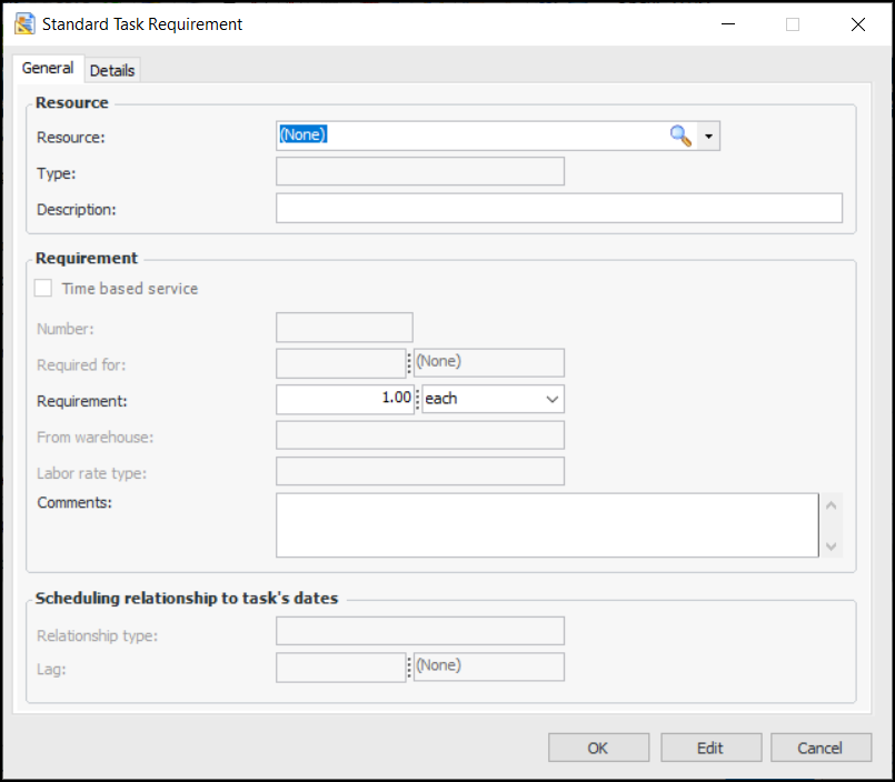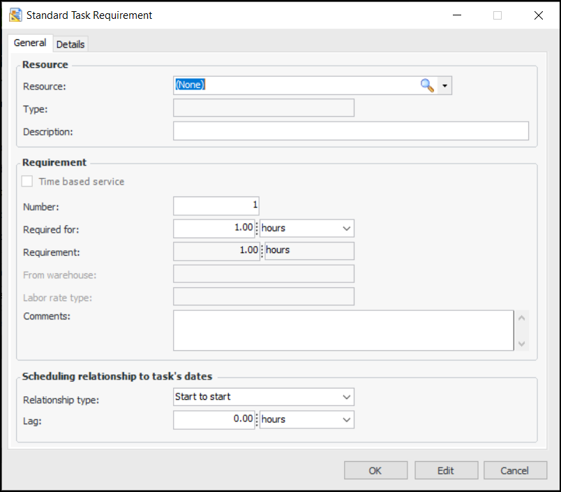 You can specify all of the requirements needed to perform the standard task, including trades, stocked and non-stocked materials, tools, and services. Any of these requirements can be selected from the resource catalog.To Add a Material Requirement to a Task Template