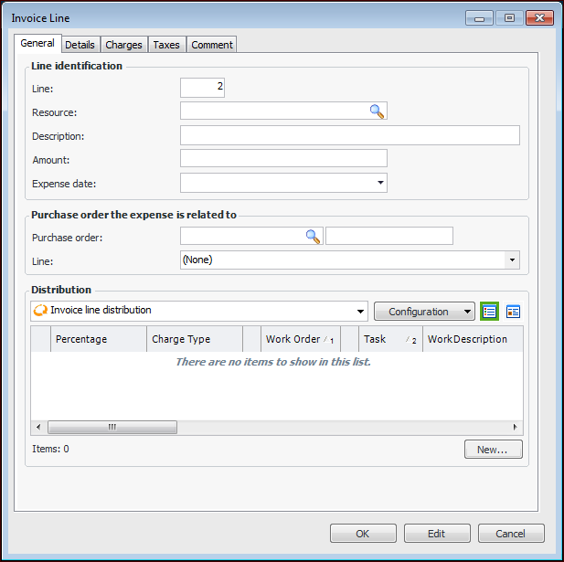 8. To enter the distribution for the line, click New. In the Invoice Line Distribution dialog, select the work order, asset, or account to charge the line to. If charging to multiple accounts, set the percentage or amount charged to the current account, and then click OK.