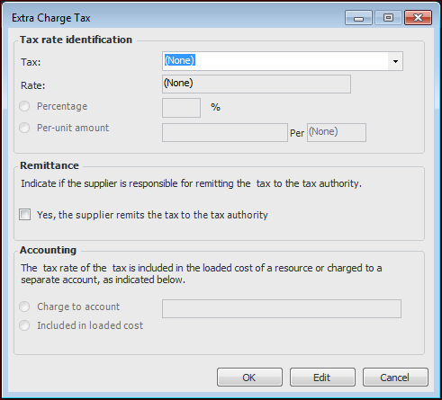 14. Click New to select the applicable taxes payable on this extra charge. The Extra Charge Tax dialog appears.