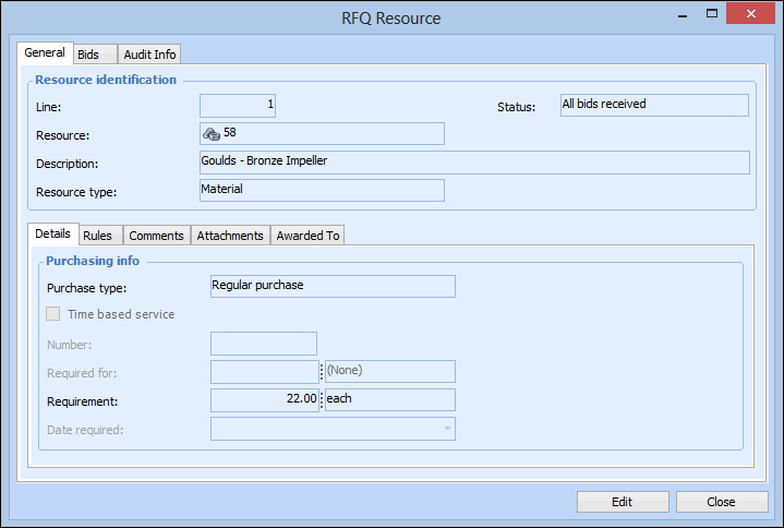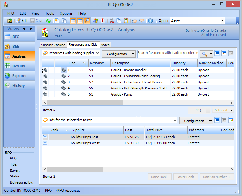 This topic explains how to analyze the bids for each resource on an RFQ. To analyze the bids for the whole RFQ, see Analyzing Bids to Find the Best Supplier For an RFQ.To Analyze Bids for a Resource