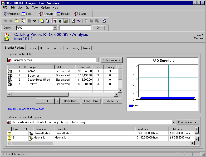 4. To have the system rank the bids for each supplier, click the RFQ list, Rank Suppliers, and then either By Number 1 Rankings or By Total Cost.The system calculates a rank for each supplier, which is shown in the Rank column of the top table. The number of resources for which each supplier is the leading bidder is shown in the Leading column.