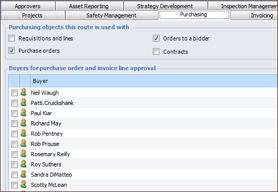 Concepts Tasks Settings Limiting Approval Routes to Specific Buyers By default, all buyers are available for an approval route when that route is created. However, if a route is used to approve purchase orders, contracts, or invoice lines, you can restrict the route to a specific buyer or buyers. Adding a buyer to an approval route means that only purchase orders, contracts, or invoice lines that are the responsibility of that buyer can be sent to the route. Objects assigned to other buyers cannot be sent to the route. When you send a purchase order, contract, or invoice line for approval, the system filters the list of available approval routes so that only appropriate routes can be selected. For purchase orders and invoice lines, the system can be set to choose routes based on either the buyer responsible or on the GL account being charged. If the site has been set up for approvals based on the GL account, selecting buyers on the approval route does not affect the route selected by the system. In other words, if the site is using GL account approval routing for purchase orders and invoice lines, selecting buyers on an approval route only affects route selection for contracts. This topic explains how to select buyers for an approval route. To Limit an Approval Route to Specific Buyers 1. In the Approval Route window, select the Purchasing or Invoicing tab. For example: 2. Select each buyer that you want to add to the route. If you do not select any buyers, the route is available to approve requests for all buyers. Note: You can add the same buyer to multiple approval routes. 3. Save the approval route.