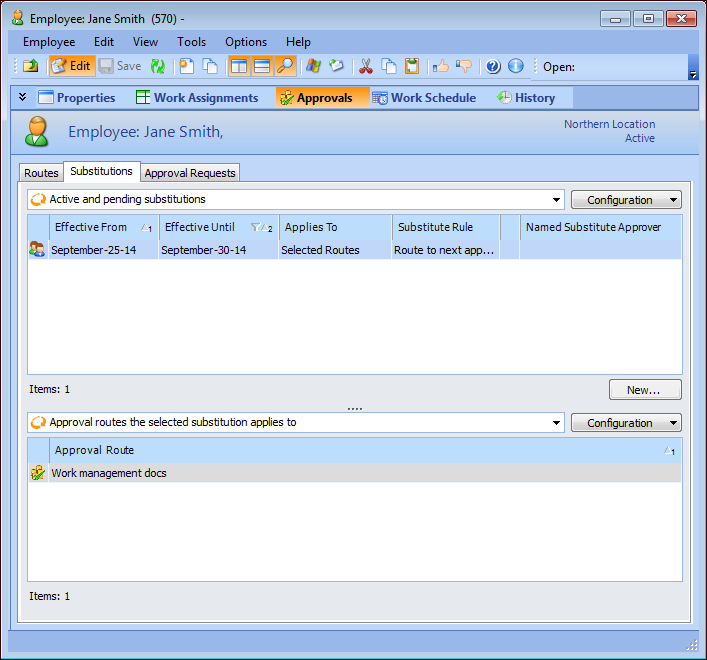 4. Select the Approvals view, Substitutions tab. The top list shows the active and pending substitutions for the employee. The bottom list shows the approval routes to which a substitution applies.