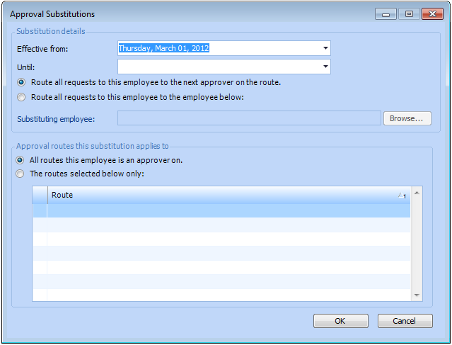 7. If a specific employee is the substitute, then select Route all requests to this employee to the employee below and click Browse to select an employee name.