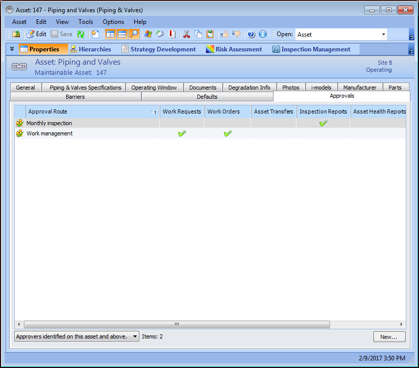 3. Select the Properties view and the Approvals tab. The list of approval routes for this asset appears.The Approvals tab displays the approval routes that include the asset and the types of documents approved. You can adjust the display by selecting an option from the list at the bottom of the tab.