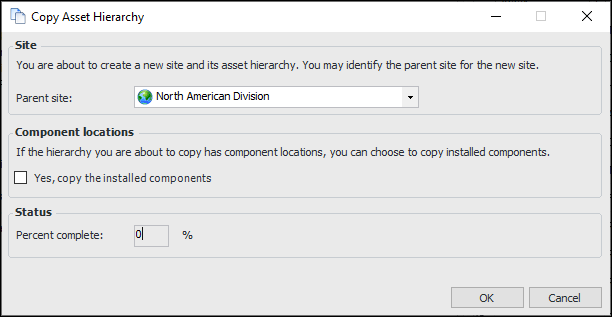 5. When you are finished, click OK. The status indicator shows the progress of the copy. Copying an entire site hierarchy can take a few minutes, depending on the number of assets being copied. APM opens the new site asset.