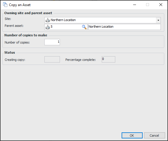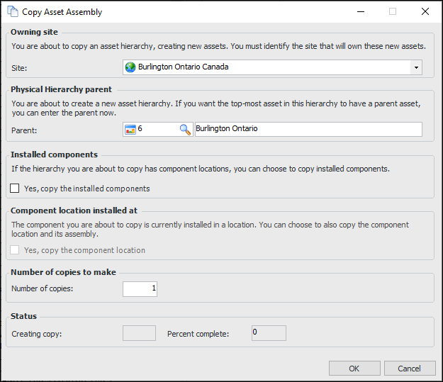 6. Enter the number of copies, and click OK. The system creates and opens a new asset record. By default, the new asset has all of the properties of the asset that you copied.To Copy an Assembly