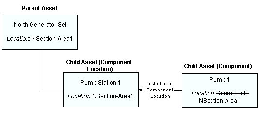 Component locations indicate where a component is located on a maintainable asset or in an asset group. For example, the location of the pump (component) on the pumping system (maintainable asset or asset group) is the component location. Component locations can be worked on: users can write work requests and work orders for component location assets. Component locations are also often the assets that you charge the costs for the work to. Those costs are shared with the installed component, the parallel location (if it exists), and its parent asset in the hierarchy.Organizations
