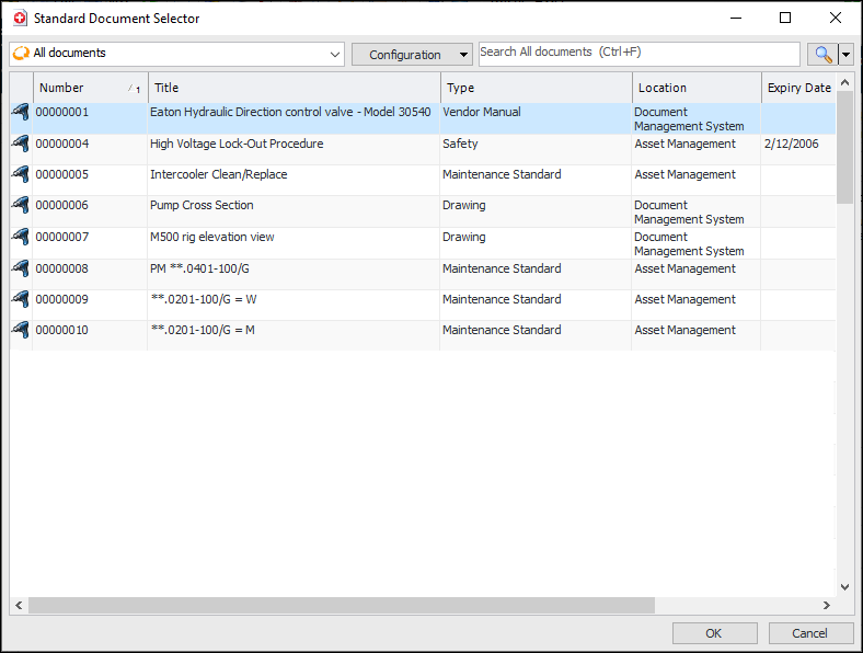 4. Select one or more documents and click OK. The documents are added to the list for the asset. For example:To Add a Specifications Document to an Asset