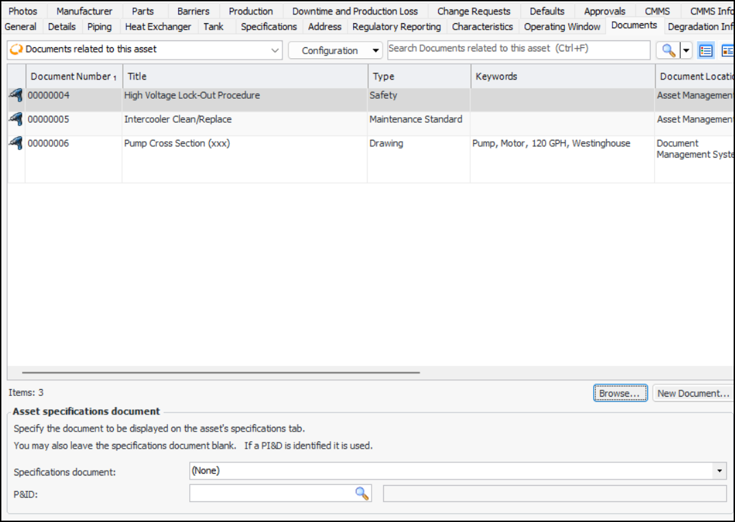 1. Open the asset, select the Properties view, General tab, and then the Documents tab. The tab lists any documents that are currently linked to the asset.