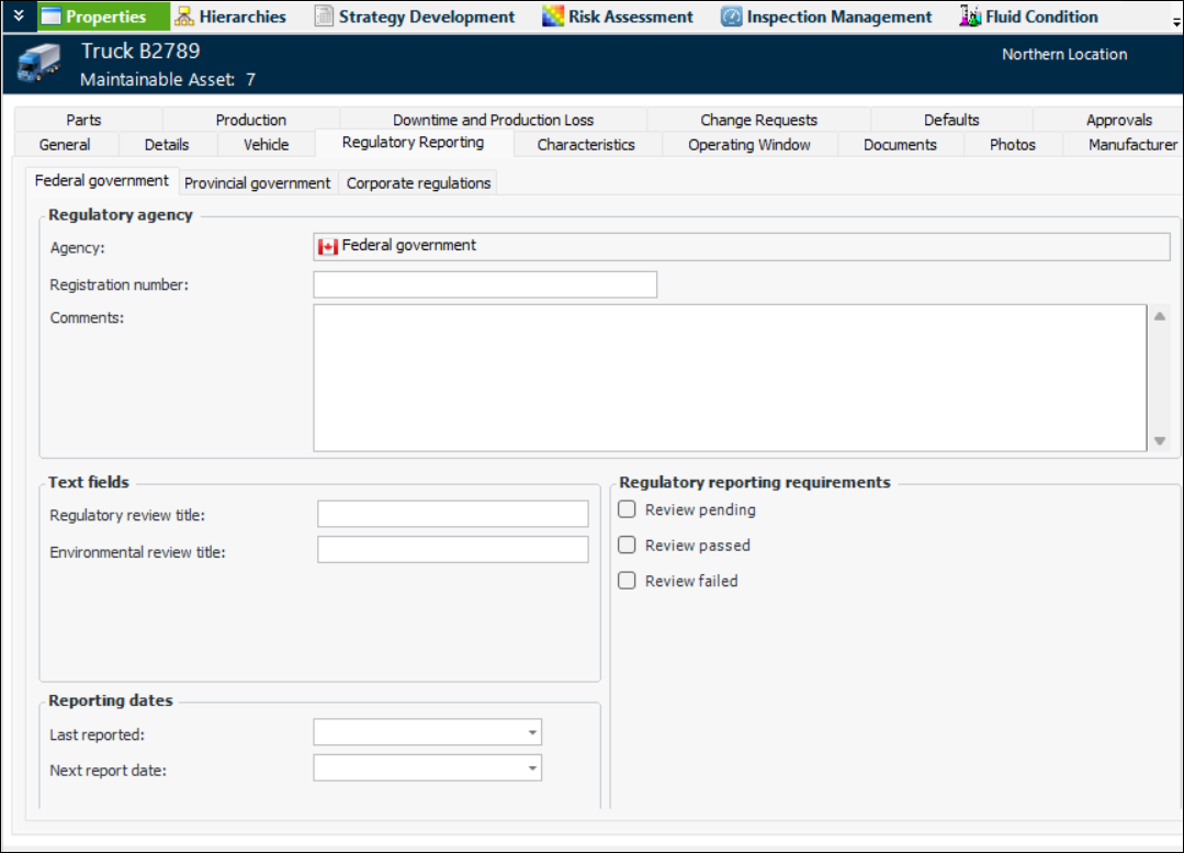 1. In the Asset window, select the Properties view and the Regulatory Reporting tab. For each regulatory agency defined for the site and selected in the asset type, a separate tab represents the agency and provides text fields, dates, and check boxes. The information differs depending on your organization’s requirements. For example:
