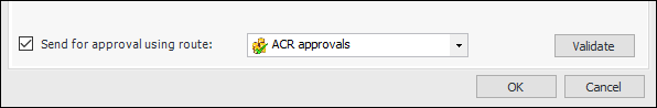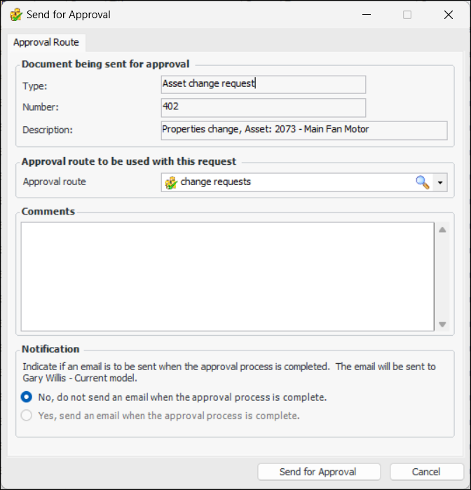2. At the bottom of the New Properties Change Request dialog, select Send for approval using route and choose the approval route. For example:To Send an Existing Asset Change Request for Approval