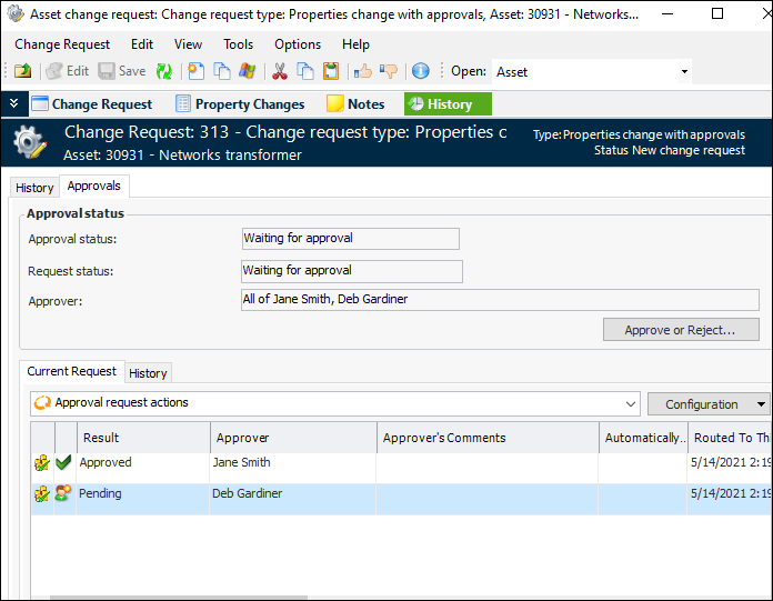 6. Click Send for Approval to send the request to the first approver on the route. The change request’s approval status changes to “Waiting for approval”.Tip: To see the status of the approval request, open the Asset Change Request window, select the History view and then the Approvals tab. For example: