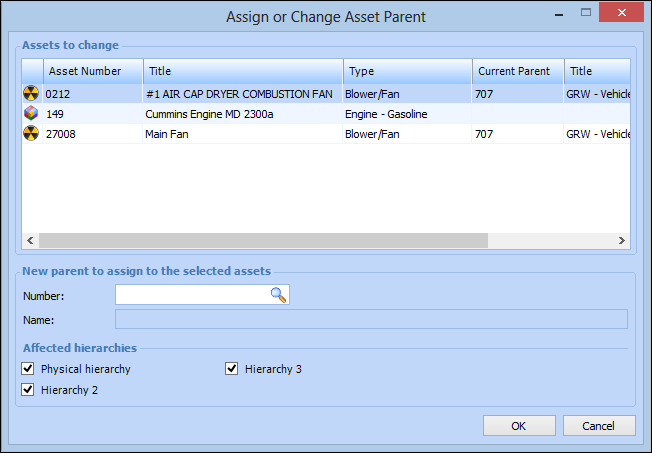 2. Select each of the assets that you want to change or assign to a parent asset, then right-click and click Change Parent Asset. The Assign or Change Asset Parent dialog appears, for example: