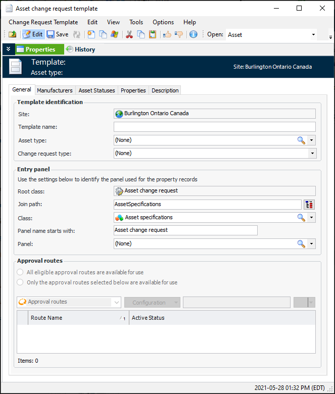 3. Click New. The Asset Change Request Template window appears: