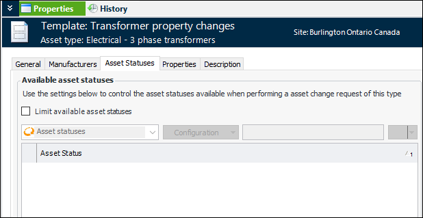 13. If you wish to restrict the asset statuses that are available in change requests that use the template, click Limit available asset statuses. The table is populated with asset statuses, which you can select from.