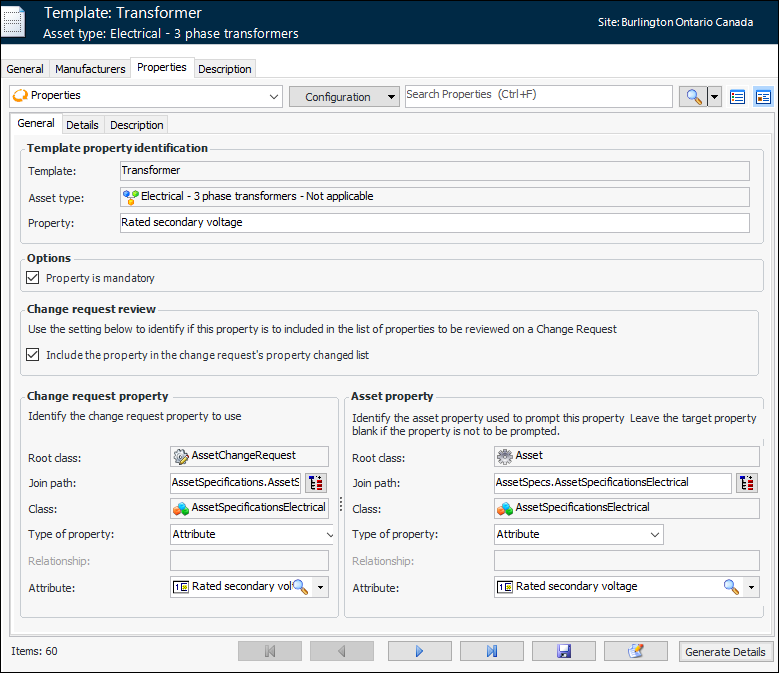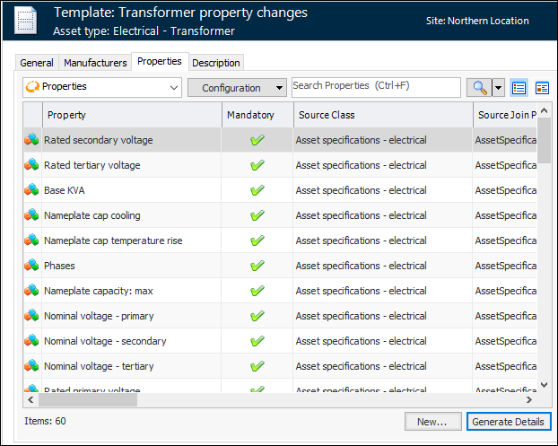 14. Select the Properties tab. Click Generate Details to populate the table with properties from the asset type panel that you selected on the General tab. For example: