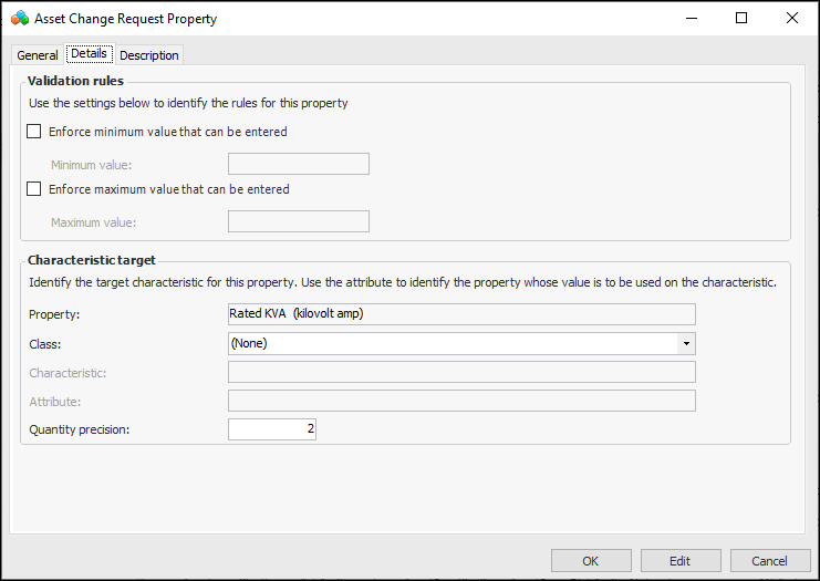 19. Select the Details tab to set the validation rules and the target asset characteristic for each property. For example: