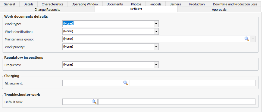 16. Select the Defaults tab to choose default selections for the asset’s work documents, regulatory inspections, and so on.