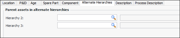 If you are using additional hierarchies, you can select the Alternate Hierarchies tab to establish the new asset’s position in it. This tab lists all of the hierarchies defined for the enterprise. For example: