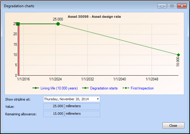 Tip: Click Chart to display the Degradation Charts dialog and view the degradation information in chart form. As indicator readings are taken to track degradation, the inspections are added to the graph.