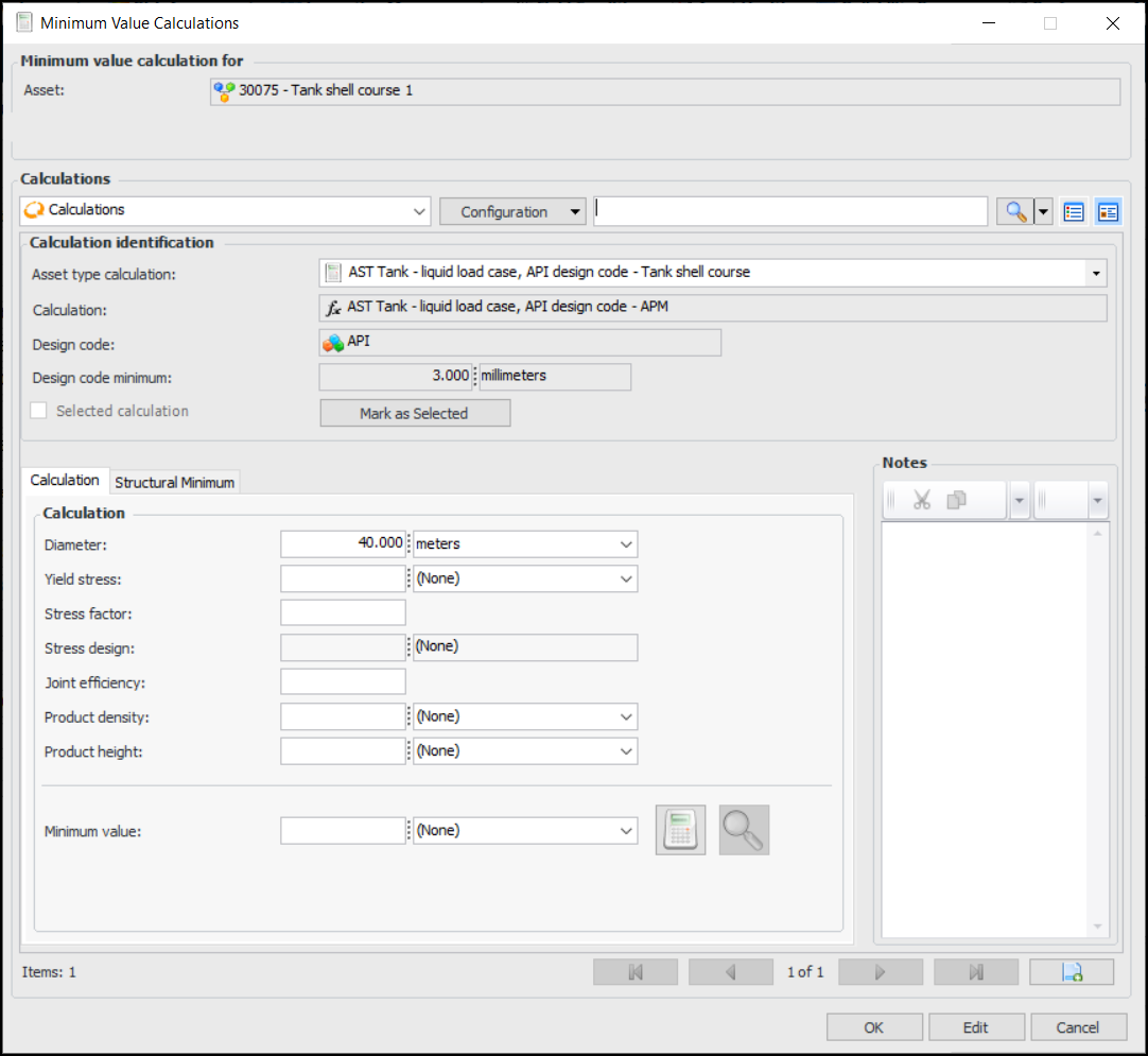 If the Minimum Value Calculator is supported by the asset type, you can have APM calculate the asset’s minimum degradation value using the formula appropriate to the asset type and design code (for example, API or BSI). Using the Minimum Value Calculations dialog, you can enter the asset’s dimensions and specifications and then click Calculate to arrive at a minimum value. You can try other formulas and inputs and then select the appropriate result to assign to the asset’s degradation information.Tip: The formulas that are used to create calculations are provided by industry standards organizations, such as API (American Petroleum Industry), BS (British Standards), and ASME (American Society of Mechanical Engineers). For example, APM provides two versions of the liquid load case calculation for atmospheric storage tanks (API and BS design codes). For information about setting up calculations for your organization, see Creating a Degradation Minimum Value Calculation.Structural Minimum Thickness for Pipe
