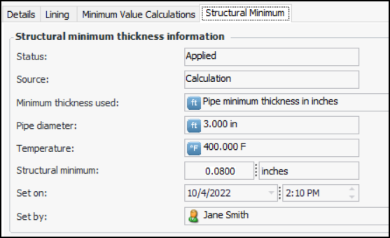 4. The Calculation area displays the panel assigned to the calculation, which differs depending on the calculation’s design. Enter the values and units of measure to be used to calculate the minimum. Any existing values are supplied by the asset’s or its parent’s subtype or specification properties.If you are working with a pipe asset, the asset type might support a structural minimum thickness lookup table. After calculating the minimum value, select the Structural Minimum tab to see whether the structural minimum value was applied. For example:
