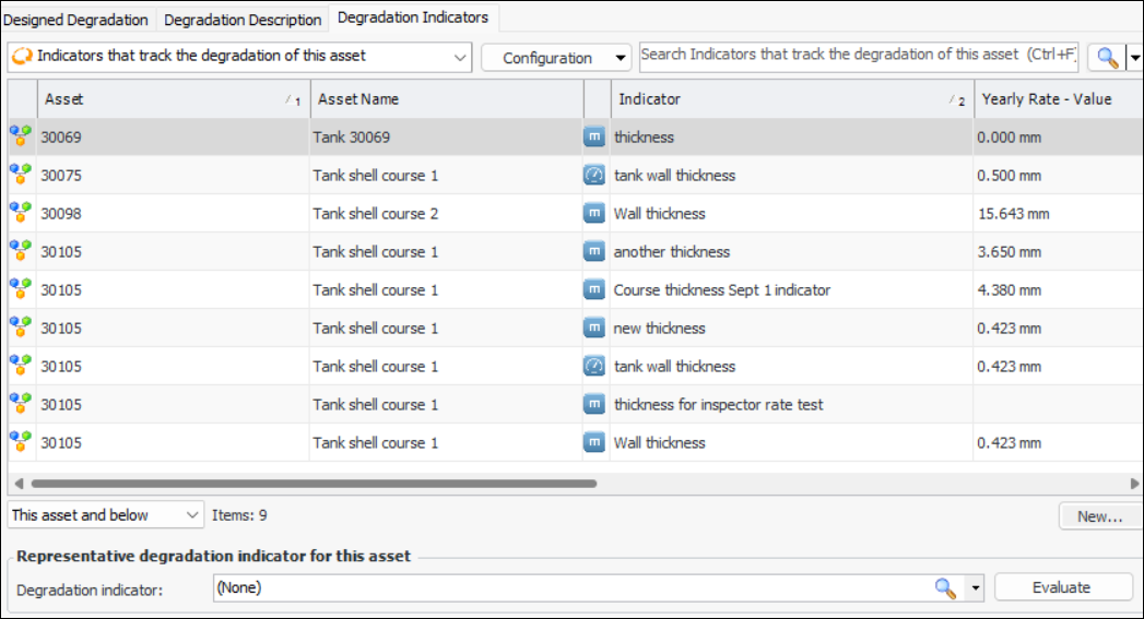 • If the asset type’s settings allow APM to automatically update the representative degradation indicator, click Evaluate to select the indicator. APM selects the indicator based on either current rates or design rates, as specified by the asset type settingTo Calculate the Minimum Degradation Value