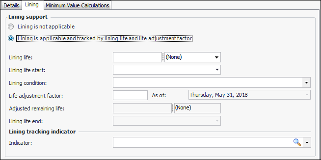 5. If the asset has lining properties that affect the asset’s degradation rate, select the Lining tab. For more information, see To Add Lining Degradation Information.