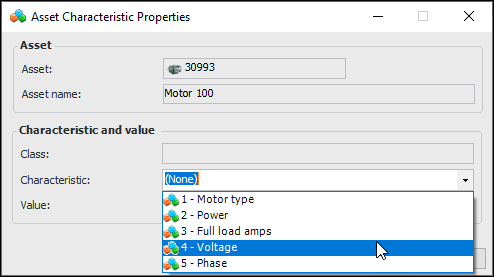 • The Characteristic list is populated based on the asset type. Select a characteristic from the list. For example: