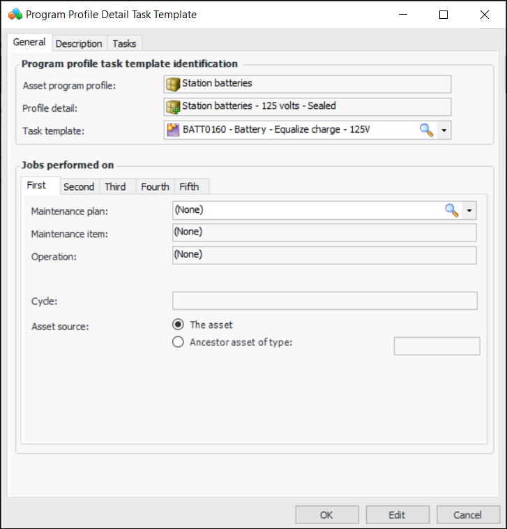 2. For each detail that you wish to add, click New. The Asset Program Profile Detail window appears:Note: When the work document system is AssetWise Interoperability, the Jobs tab is not available in this window.